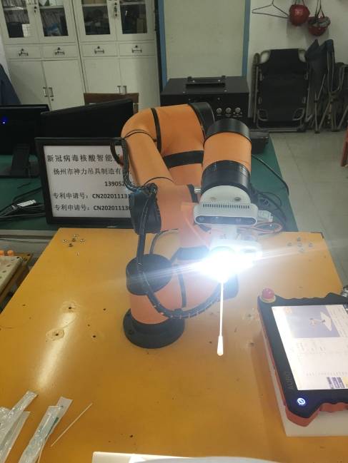 “无接触咽拭子采集系统”由机械臂、3D相机、咽拭子握持结构、试管定位系统、身份信息标注系统、工作台等部分组成。项目研发团队负责人范斌表示,该系统最大的应用价值在于,可通过非接触方式从咽部或扁桃体部位采集分泌物,代替目前医护人员手动采集方式,从而降低医护人员的感染风险和劳动强度,为新冠疫情防控提供科技“神力”。