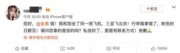 金晨坐飞机拿错行李箱,工作室回应称已经换回