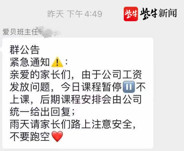 2020年10月底,陈先生在南京爱贝国际少儿英语(油坊桥校区)给孩子报名上课。今年4月中旬,续费12300元,开始第二阶段的上课。5月26日,却在家长群里被告知停课。“由于公司工资发放问题,今日课程暂停不上课,后期课程安排会由公司统一给回复。”陈先生向记者出示家长群信息。