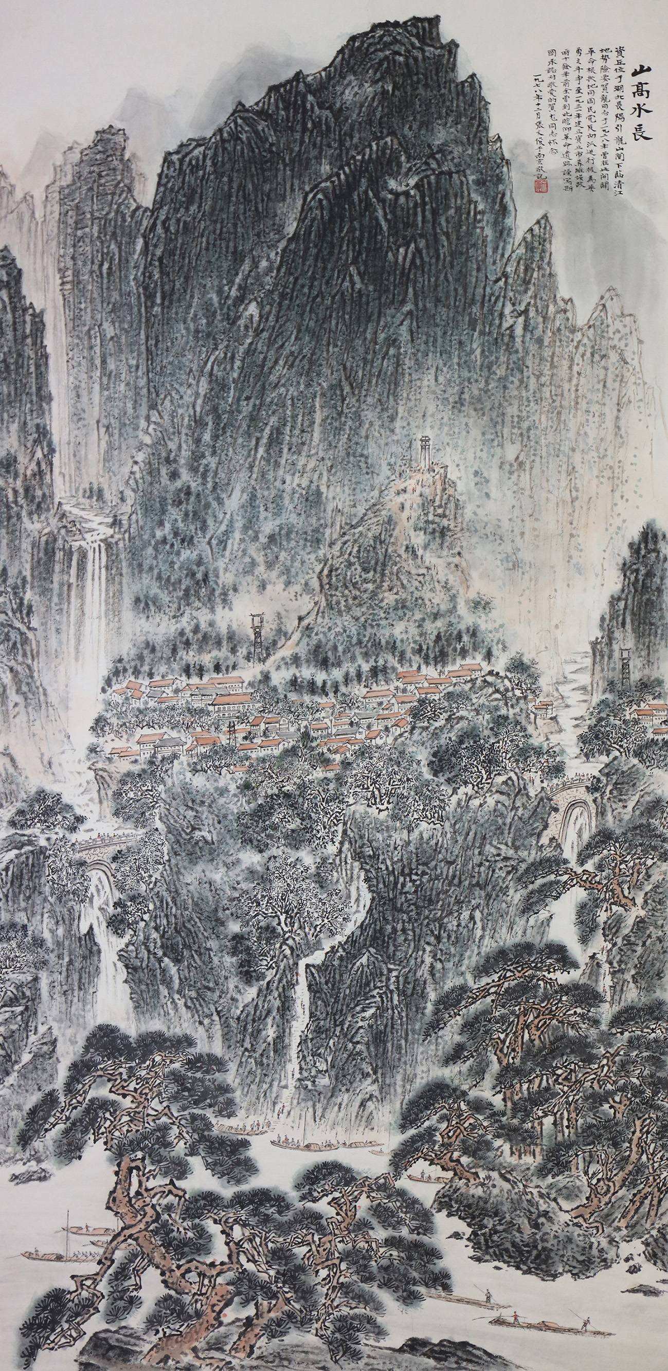 此画是张文俊先生于1978年所作,他的作品追求刚健,恢宏、灵秀于一体,这件《山高水长》便是其中一件代表之作。画作描绘的是我国湖北省长阳县资丘广阔的山河壮丽之景,其线条灵动、画骨刚健,构图层次分明呈垂直式。体现出画作的严肃端庄。也突显出我国山河的壮阔宏伟。作品中画家强调骨法用笔,驾驭着中国画线的力度和韵律。在章法上,画家讲求崇高美,以山高水长去体现磅礴的气势。作品既有深厚的传统功力,又有独到的新创造,以纯真的心性,激荡的情怀,去表现大山大川。又结合历史背景,也表明了画家对于贺龙的崇敬之情和对我国河山辽阔,地势磅礴、山河秀丽的倾佩与崇尚之情,给人以心灵的震撼。