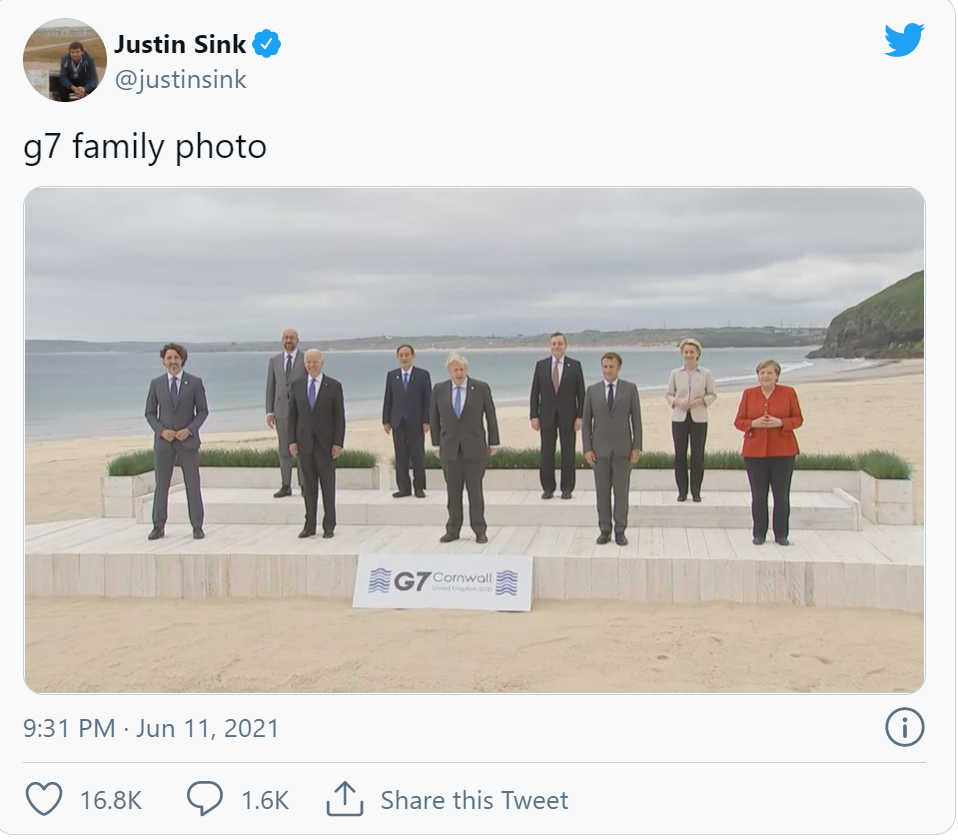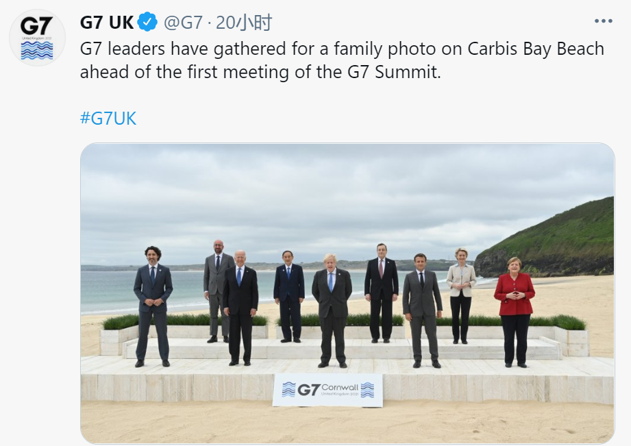 据美国福克斯新闻介绍,九人合影拍摄于康沃尔郡海滨度假胜地卡比斯贝。在“G7英国”官方推特发布的照片中,与会领导人背靠海湾,前排从左至右依次是加拿大总理特鲁多、美国总统拜登、英国首相约翰逊、法国总统马克龙和德国总理默克尔,后排从左至右分别为欧洲理事会主席米歇尔、日本首相菅义伟、意大利总理德拉吉以及欧盟委员会主席冯德莱恩。↓