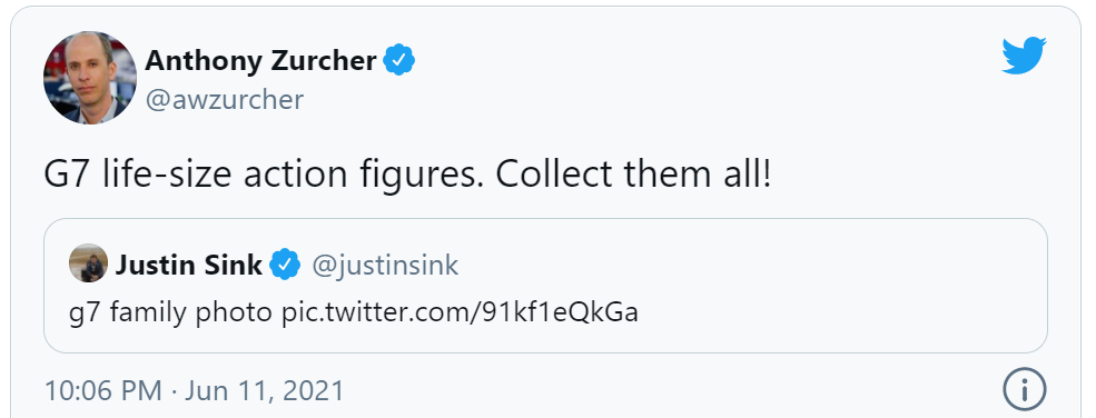 英国广播公司(BBC)记者安东尼·泽克尔转发并打趣称,这是“G7真人大小的人形公仔。收集他们所有!”↓