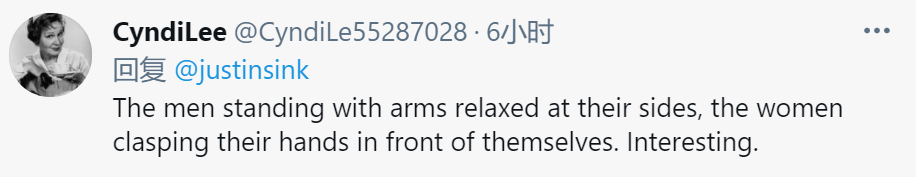 还有人说,“男士们双臂放松地放身体两侧,女士们双手紧握身前。有趣。”