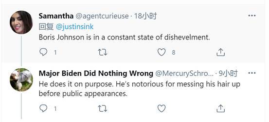有人说“鲍里斯·约翰逊状态总是有些凌乱。”另一人回复道,“他是故意这样做的。他在公开露面前会把头发弄乱,这是出了名的。”↓