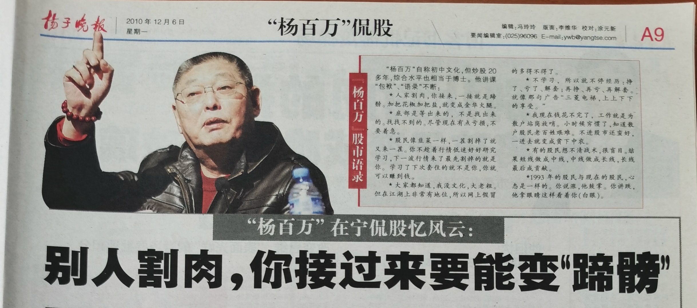2010年12月,作为扬子晚报25周年感恩行动之一,“杨百万”曾受邀到南京给股民读者做演讲。扬子晚报记者因此得以专访到“杨百万”,并近距离感受这位“第一股民”的传奇。
