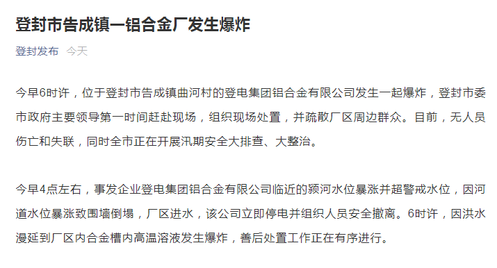 登封一铝合金厂爆炸原因:水淹厂区,合金槽内高温溶液爆炸
