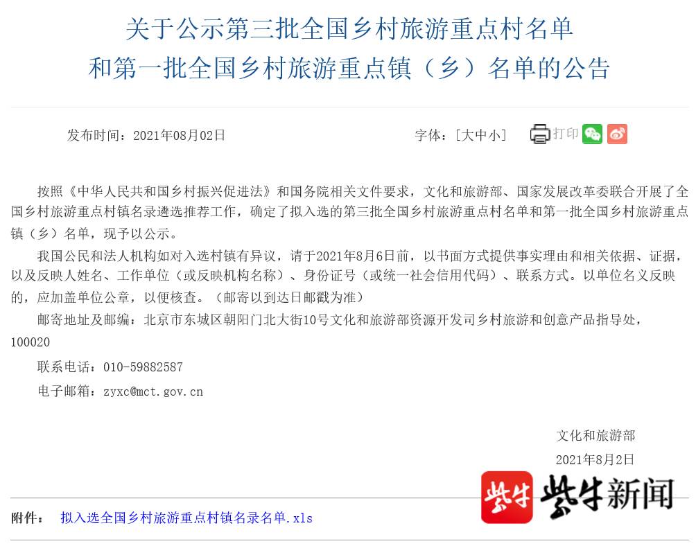 据悉, 8月2日,国家文化和旅游部发布了《关于公示第三批全国乡村旅游重点村名单和第一批全国乡村旅游重点镇(乡)名单的公告》,文化和旅游部、国家发展改革委联合开展全国乡村旅游重点村镇名录遴选推荐工作。目前,已确定拟入选的第三批全国乡村旅游重点村名单和第一批全国乡村旅游重点镇(乡)名单。