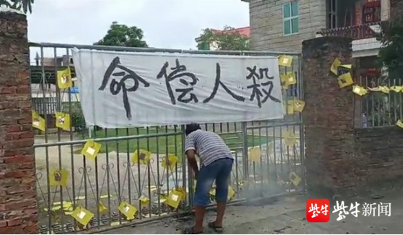 小雯家属在案发地门口拉横幅