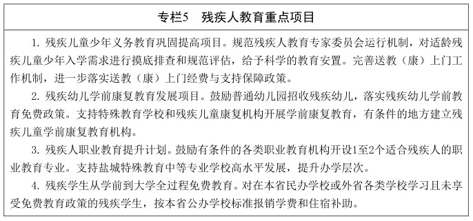 加强残疾人教育支持保障能力。完善残疾人就学保障政策,全面落实残疾学生从学前到大学全过程免费教育。落实特殊教育生均公用经费按当地普通学校生均公用经费8倍以上拨付政策,落实残疾学生和残疾人家庭子女优先享受国家助学金、奖学金和助学贷款政策。