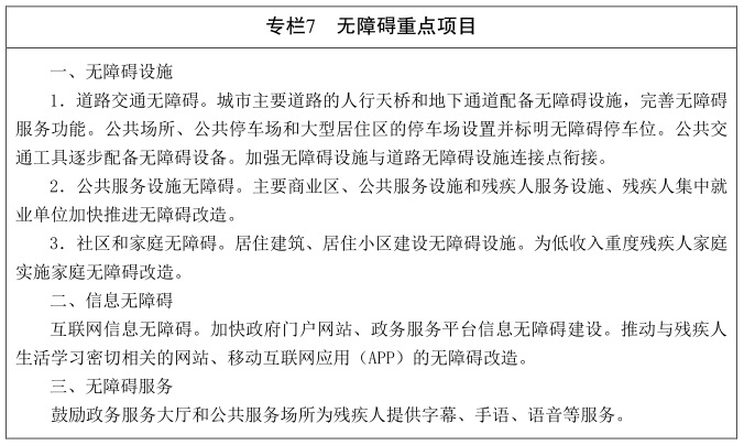 提升无障碍环境建设水平。鼓励社会力量参与信息无障碍技术和产品研发。继续开展全国无障碍环境市县村镇创建工作和残疾人家庭无障碍改造,对已建成的无障碍设施开展智能化升级。道路交通无障碍、公共服务设施无障碍、社区和家庭无障碍。同时还要做到信息无障碍以及鼓励政务服务大厅和公共服务场所为残疾人提供字幕、手语、语音等服务。