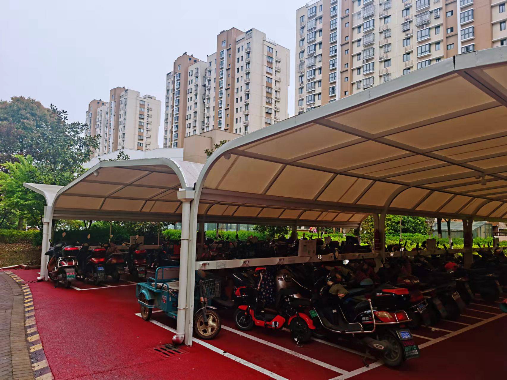 银白色大气的停车棚、亮红色坚实的橡胶地面、整齐摆放的各色电动的车……无锡市滨湖区望溪社区雪溪苑新建的智能充电桩设施,已经成为小区里一道靓丽风景线。