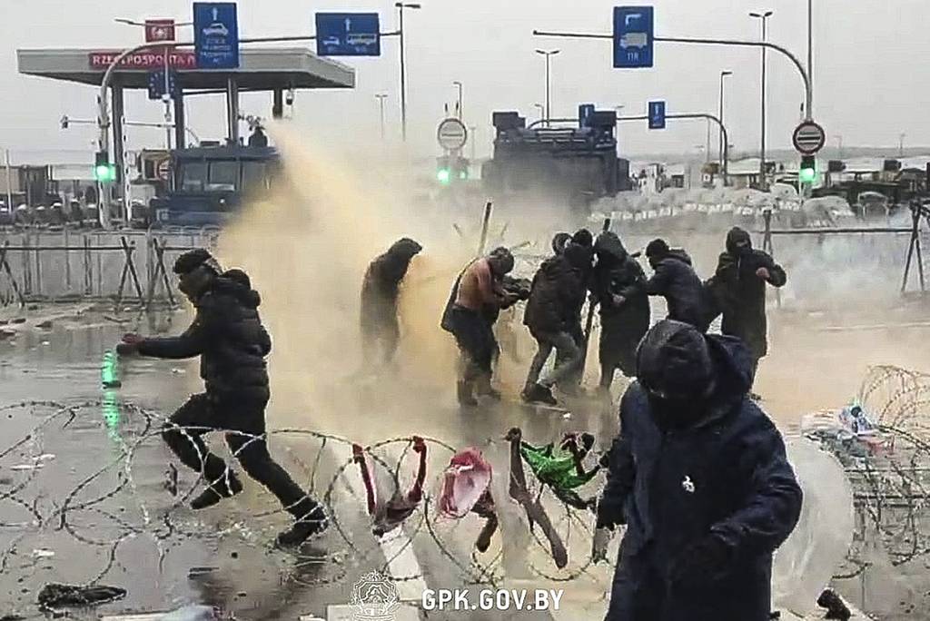 据俄罗斯卫星通讯社16日报道,波兰警方当日动用水炮、催泪弹和噪音弹等武器,阻止非法移民穿越白波边境。现场图片显示,一群非法移民拆除白波边境围栏,并向布鲁兹吉边境口岸附近的波兰警卫投掷石块和树枝,波兰安全部队使用水炮、催泪弹等防暴武器回击。(海外网 张琪)