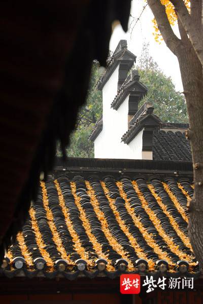 一阵风吹来,银杏树叶“簌簌”飘落,落在瓦楞间,黑色的瓦、金色的叶,色彩一暗一明,相互辉映,分外美丽。