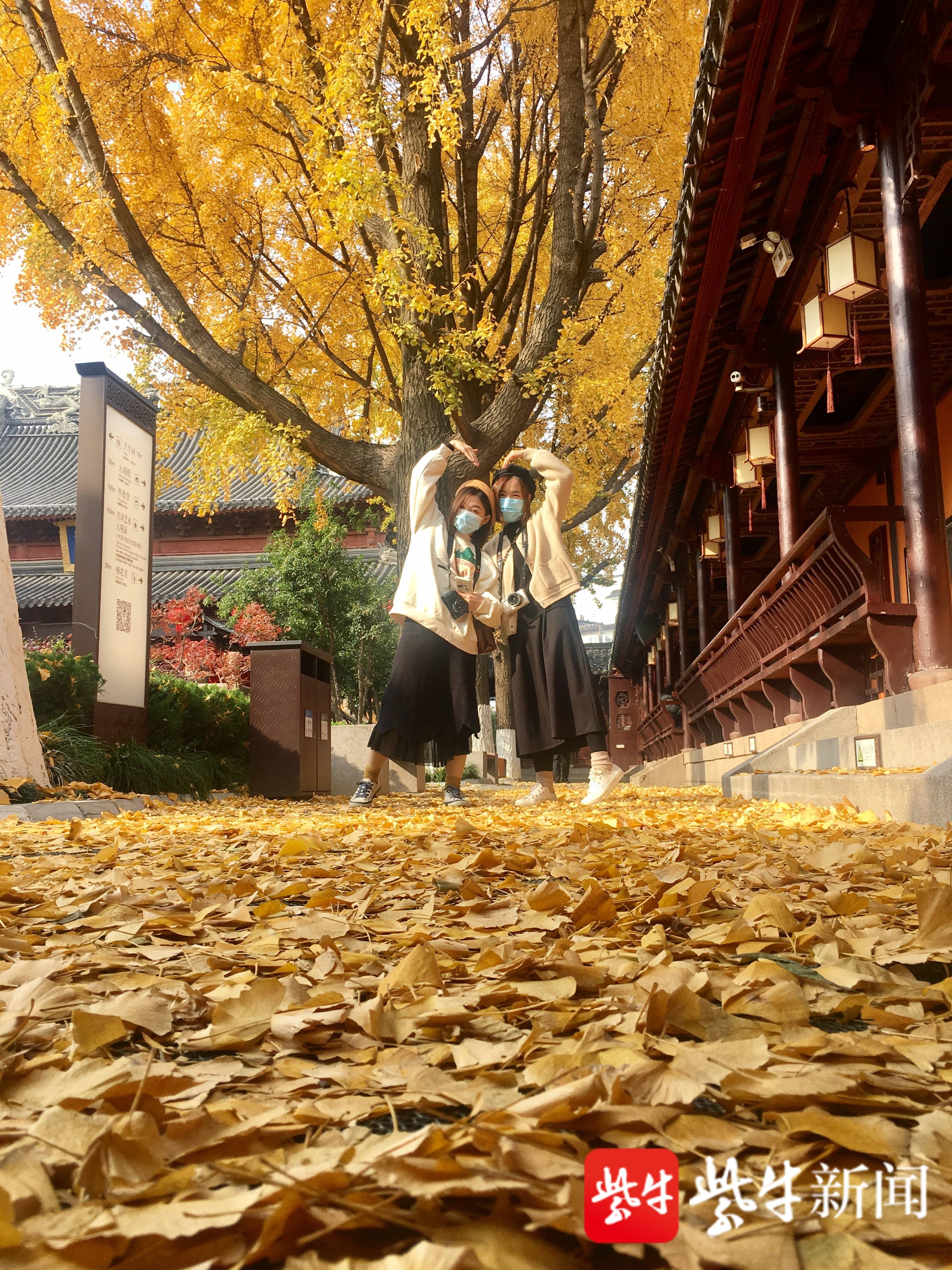 地面上也落了厚厚的一层银杏叶,如同铺了“黄金毯”,吸引不少游客纷纷在此摄影打卡。