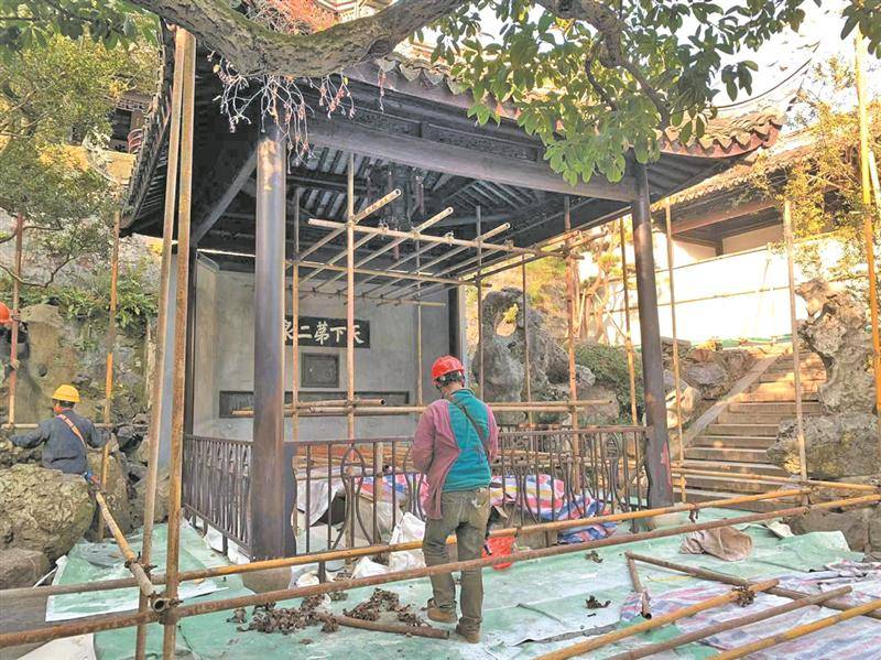 据了解,这些修缮中的景区建筑大多年代久远,修缮保护是重中之重。如荣氏梅园是第六批全国重点文物保护单位,为近现代重要史迹及代表性建筑,其中部分建筑比较老旧,所以修缮也是必须的。惠山古镇景区的二泉亭、漪澜堂均始建于唐,现存建筑为同治年间重建。彭德贵告诉记者,二泉庭院上次全面修葺是1993年,已有近三十年未进行全面整修,这次修缮的两座建筑普遍存在屋面漏雨、木构件糟朽、油饰褪色、粉刷层剥落等问题,尤其二泉亭北侧檐柱已经倾斜严重,存在安全隐患。修缮主要针对以上问题进行维修,约于一月底完工。明年可能还会对寄畅园展开修缮。