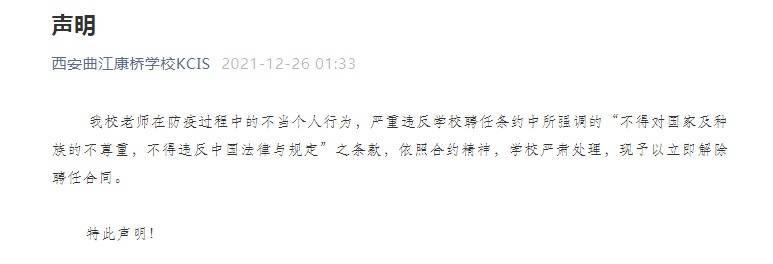 12月26日,西安曲江康桥学校发布声明称:该校老师在防疫过程中的不当个人行为,严重违反学校聘任条约中所强调的“不得对国家及种族的不尊重,不得违反中国法律与规定”之条款,依照合约精神,学校严肃处理,现予以立即解除聘任合同。