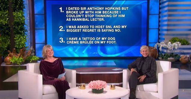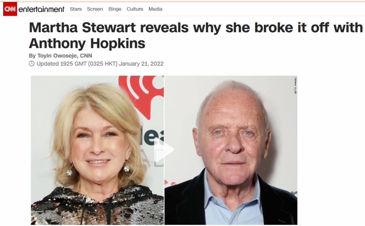【环球网报道 记者 赵建东】据美国有线电视新闻网(CNN)报道,当地时间20日,现年80岁的美国“家政女王”玛莎·斯图尔特在脱口秀节目《艾伦秀》中聊到自己与英国老戏骨安东尼·霍普金斯的恋情,并透露了两人分手的原因——担心“汉尼拔”把自己吃了。