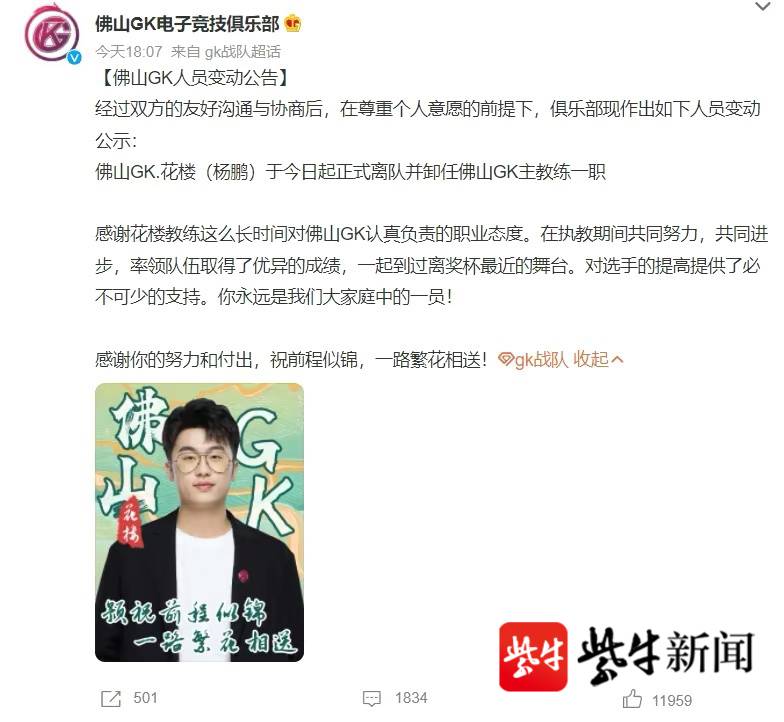 1月22日,佛山GK在社交平台上发文称,主教练花楼卸任,双方和平分手。