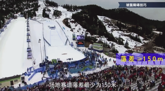 坡面障碍技巧场地由一系列障碍、跳台、杆、平台等构成,场地赛道落差最少为150米,平均坡度在12度以上。北京2022年冬奥会的赛道上设有3个跳台,运动员可以选择在每个跳台上表演不同的转体完成滑行。