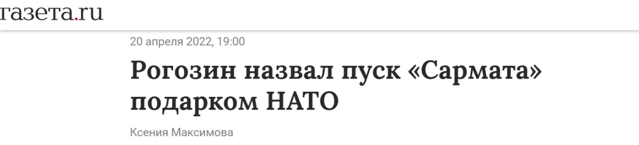 【环球网报道】俄国防部20日称俄方当天成功试射一枚“萨尔马特”洲际弹道导弹。综合俄罗斯《报纸报》、俄新社、PROFILE网站等媒体报道,俄罗斯国家航天集团公司总经理罗戈津20日在即时通信软件Telegram上发文称,这是赠送给北约的礼物。PROFILE网站报道称,罗戈津还发了一幅图,表明“萨尔马特”导弹试射是在希特勒的生日当天完成的。