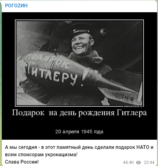 罗戈津当天在Telegram发了一张日期为“1945年4月20日”的图,图上是一名军人手持炸弹,炸弹上写有“给希特勒的礼物”字样。公开资料显示,4月20日是纳粹德国头目希特勒的生日。