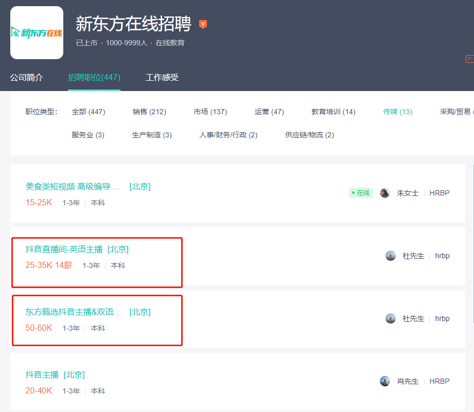 此外,招聘信息显示,英语主播待遇为月薪2.5万-3.5万元、14薪;食品类主播、抖音主播、农产品主播、带货老师待遇均为月薪2万-4万元。