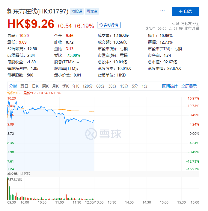 截至6月14日午间休市,新东方在线报收每股9.26港元,涨6.19%。