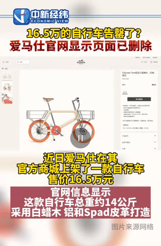近日,爱马仕上架一款自行车售价16.5万引起网友关注,中新经纬发现目前爱马仕官网已删除16.5万自行车信息。除了爱马仕,LV官网也上架自行车,车身印有LV logo,售价20万起,自行车头盔售价1.68万。