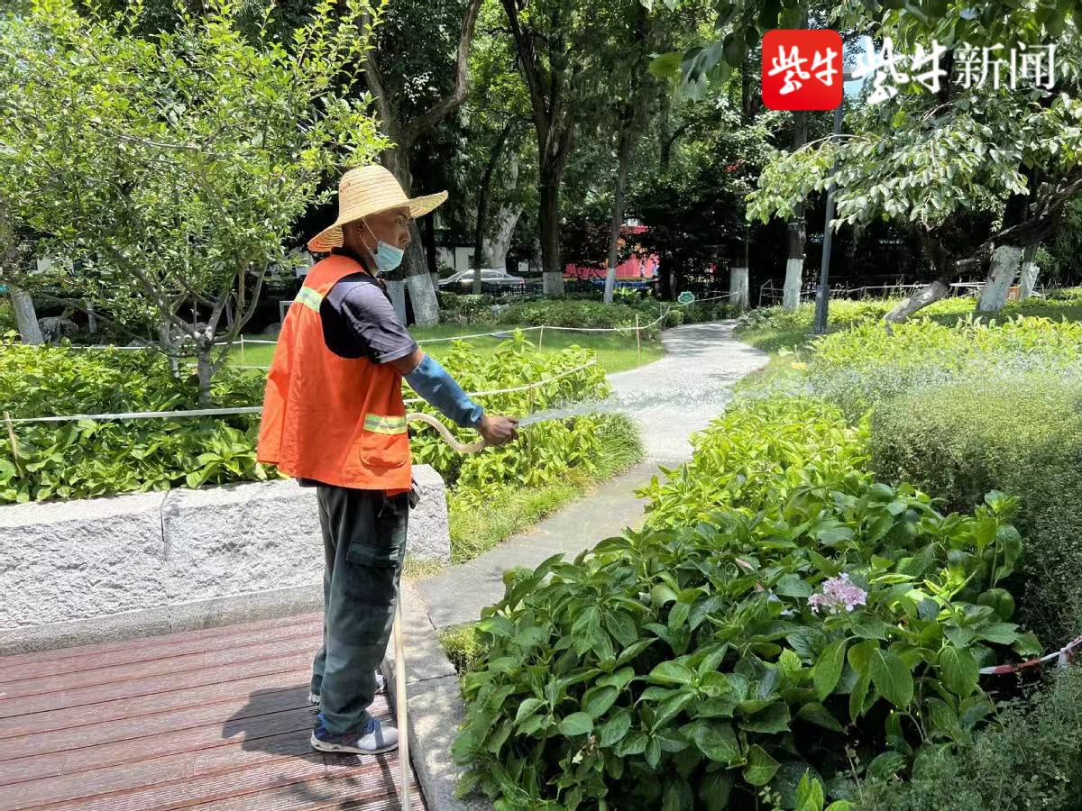 早晨7点多的和平公园内,花花草草已经“喝了”不少水。负责和平公园绿化养护的园林工人乔卫春告诉记者,夏季高温时浇水容易对植物根系造成损伤,所以要避开高温时段,大家的工作时间也相应调整为5:00至11:30。乔卫春家住聚宝山公园附近,他每天凌晨3点多起床,5点前赶到和平公园,首先给草花和草坪浇水。高温天,五六点浇水还好些,到了8点多,大家站在太阳下给树木浇水五分钟,全身汗水直淌,“一般上午要喝四大壶凉开水,还经常不够喝。”乔卫春拎着水管来来回回浇上好几遍,让水分充分渗透到泥土里,他汗流浃背,衣服湿透。9点之后,他还要在烈日下清理枯苗杂草、喷施农药,提着十几斤重的工具修整草坪,这些都是每天的日常养护工作,确保绿化苗木能够安全度夏。