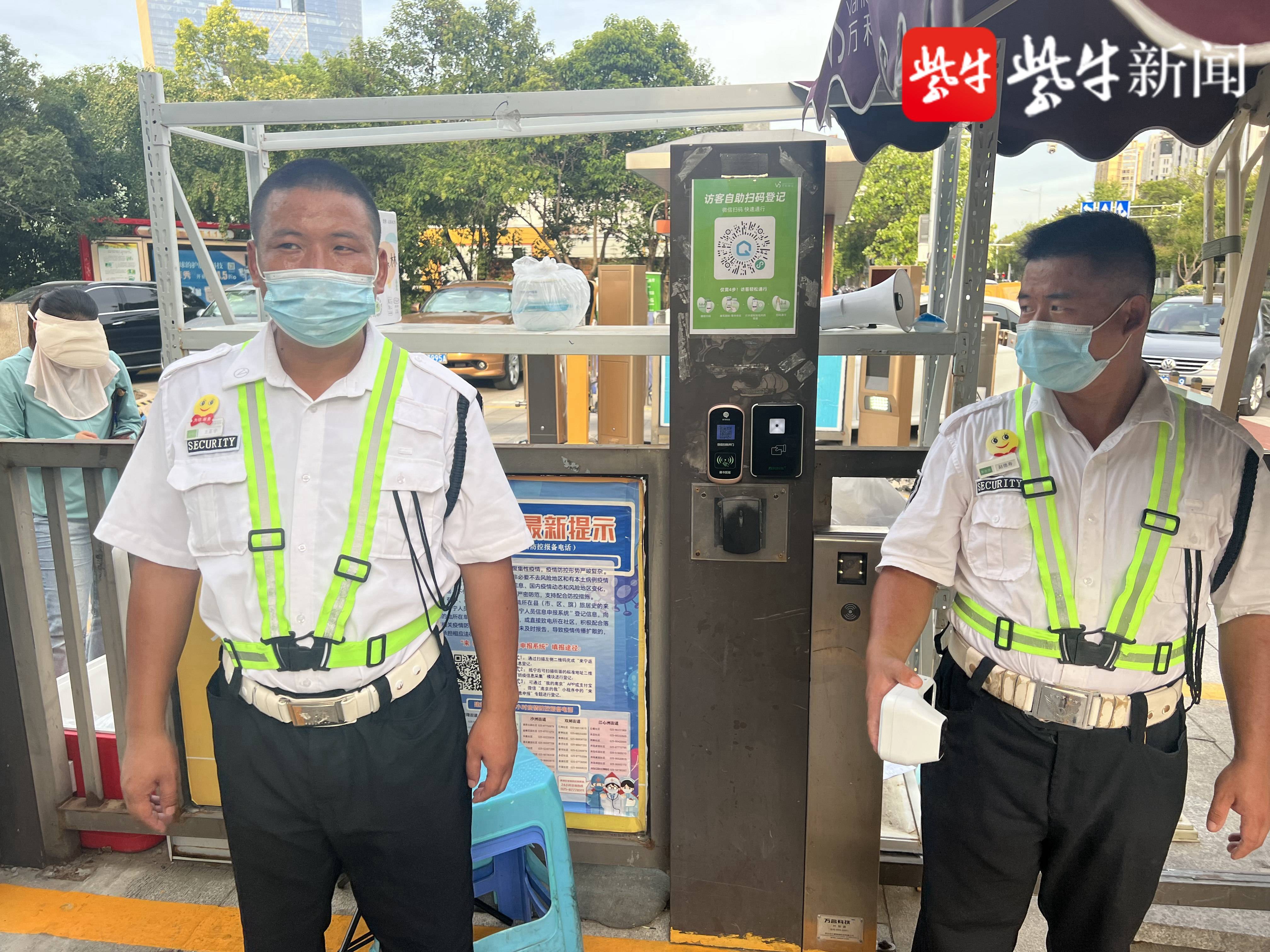 下午2时的月安花园小区热浪依旧,烈日骄阳下,35岁的赵德寿和王正宇正在南门值班。两位保安的脸部晒得通红,但是对于每个走进来的居民,两位都认真地进行温度检测。“请出示健康码和通行码,现在疫情防控不能松懈!”赵德寿老家在云南,为了生活,他来到南京,已在南京做了保安2年。“工作虽然辛苦,但是男人嘛,就要养家,看着家里人的生活质量在一天天提高,我一点也不觉得辛苦!天气总会凉快的,到时候,我再好好休息一下,好好补补觉!”