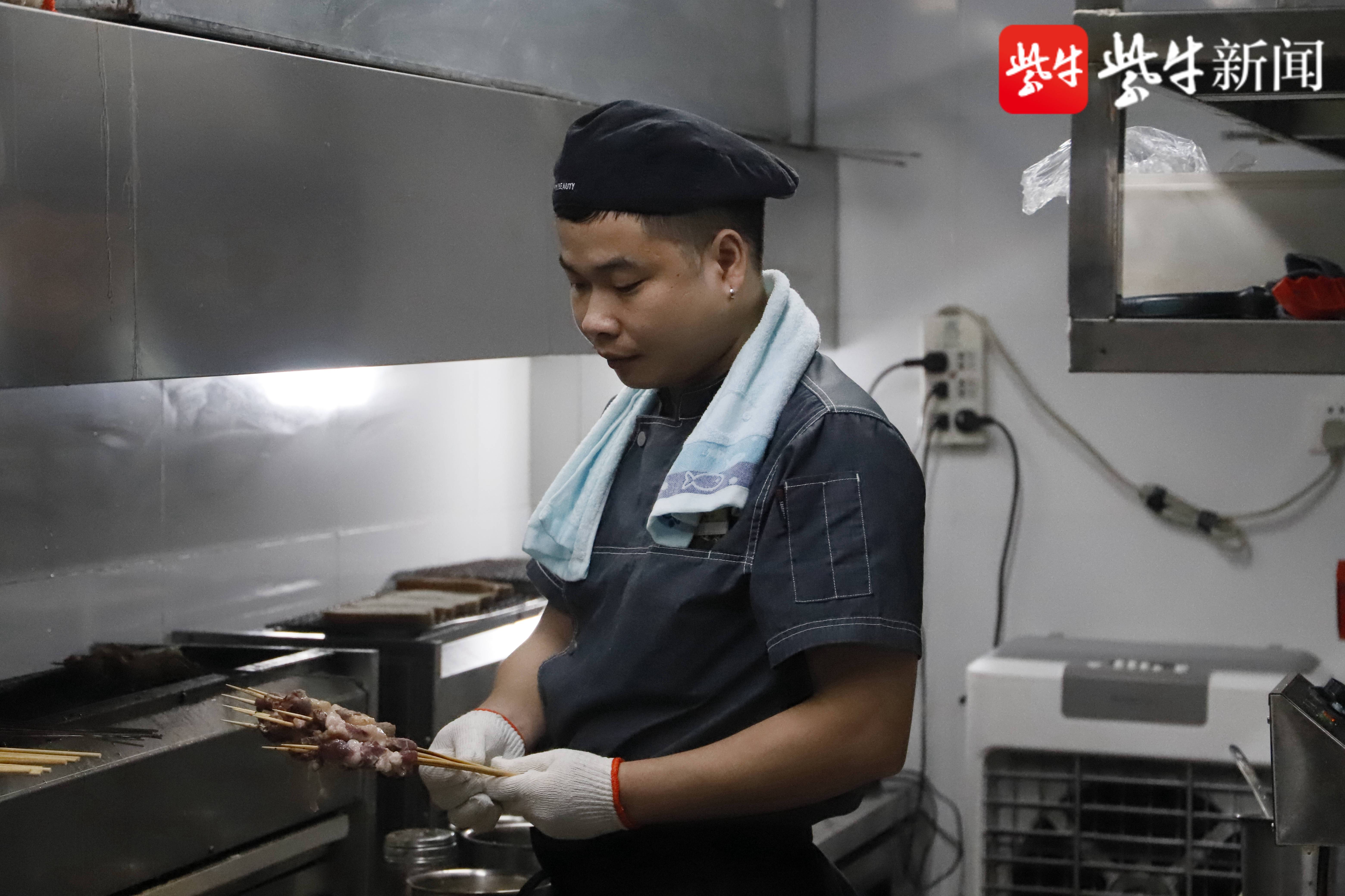 晚上9点多,位于南京市建邺区云锦路附近的烧烤摊点开始上客了。到了11点左右,各个烧烤摊点已经坐满了人。来自安徽的刘玉屏此刻肩上搭着潮毛巾,正在烤摊前挥舞双手。手上的一把烤串,经过他的加工正在变成一道道美味。作为一名“烤手”,刘玉屏已经有着10年的从业经历。“越热越忙碌。”他告诉记者,自己的工作在大夏天才是最忙碌的时候。