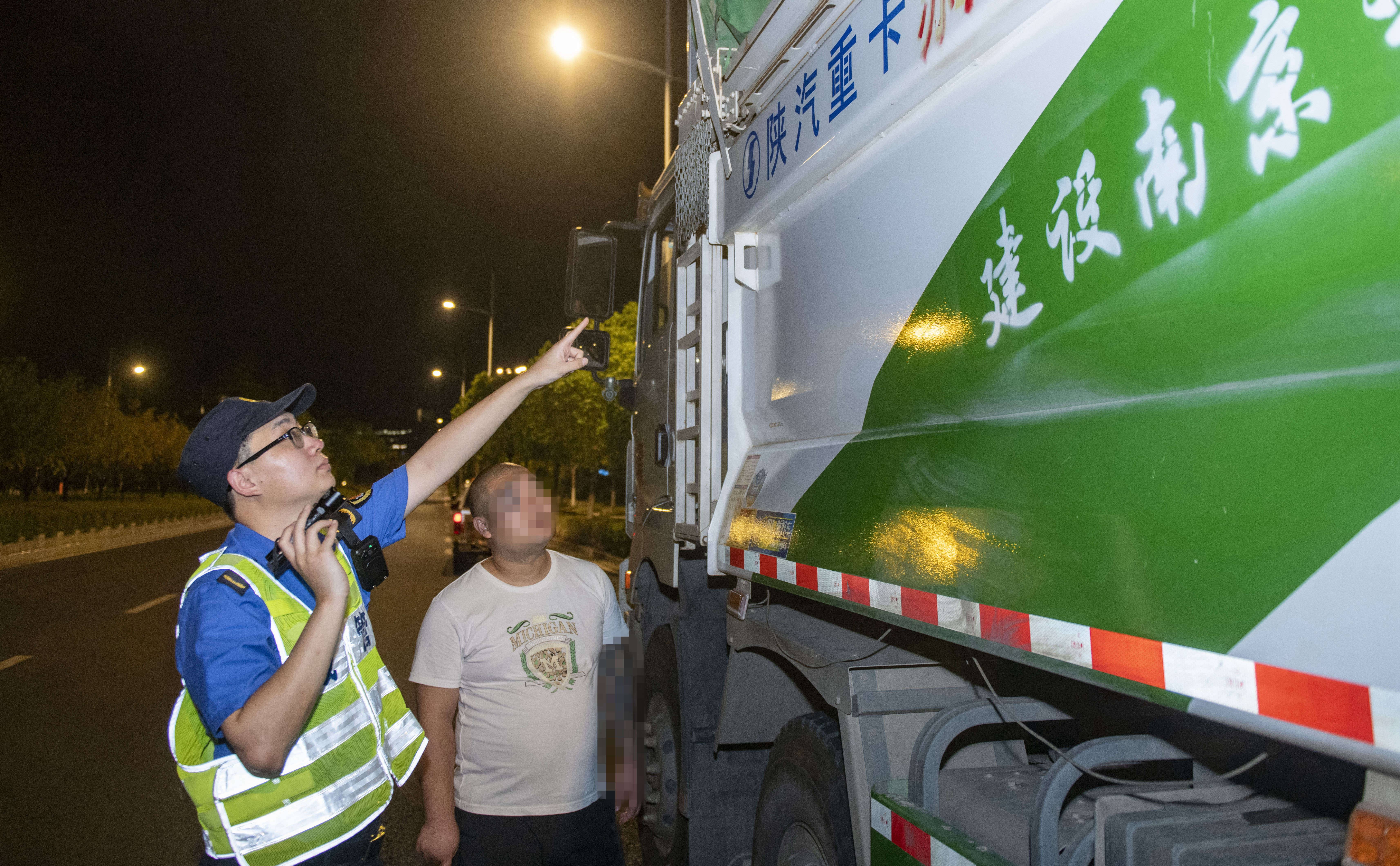 8月22日晚7点半,在仙林大道,陈李骏和同事们正在设置检查岗,对过往渣土车进行检查。车辆是否有准运手续、装载是否规范、路线是否正确……夜幕已降、暑气未散,顶着发动机轰鸣和路面、车辆散发的阵阵热浪,陈李骏和队员们细致查验,不放过每一个细节。