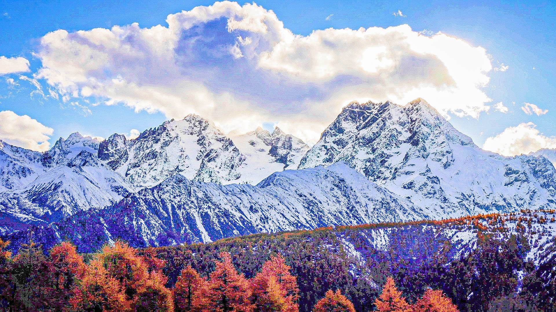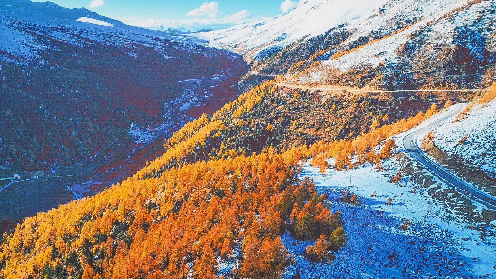 近日,云南省迪庆藏族自治州德钦县白马雪山降下深秋第一场雪,金黄色的高山针叶林与皑皑白雪同框出镜,秋冬交融,分外美丽。