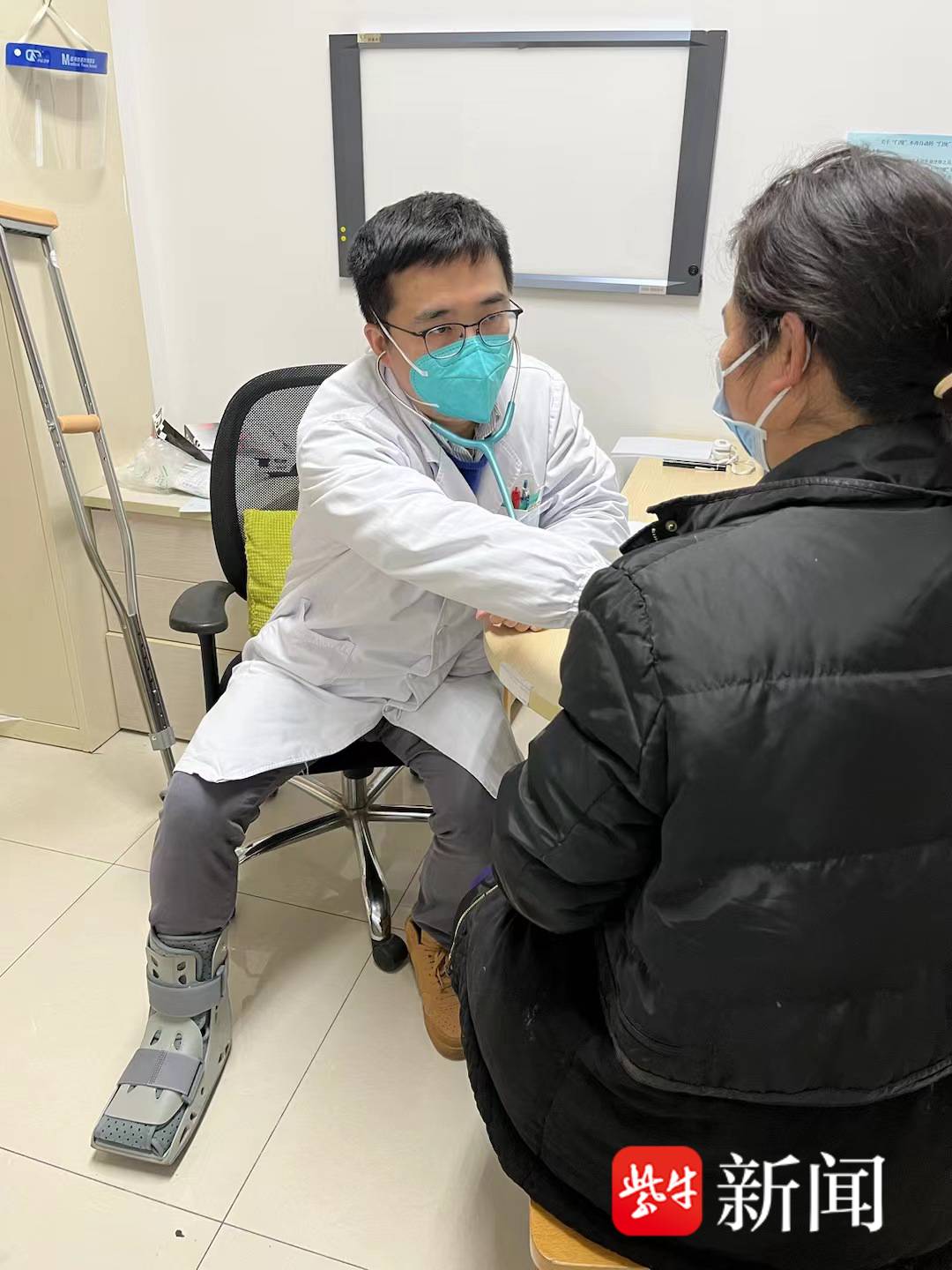 “你是哪里不舒服?舌头伸出来给我看看……”呼吸与危重症医学科门诊,右脚穿着固定支具的主治中医师唐铖正在帮患者看舌苔,这是他脚部骨折的第十天。1月17日12点多,刚下夜班的唐医生下楼梯时不慎踩空受伤,为了能走路他没有打石膏,每天穿着支具一瘸一拐地坚持到岗。