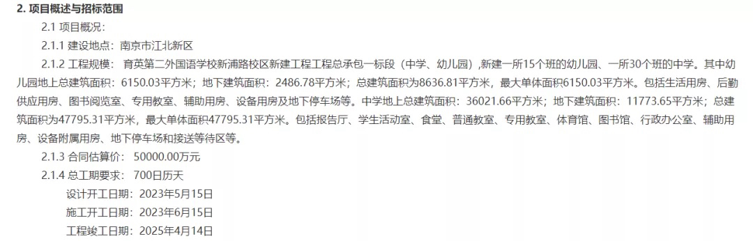 根据招标文件显示,育英二外新浦路校区新建工程总承包一标段(中学、幼儿园):新建一所15个班的幼儿园、一所30个班的中学。