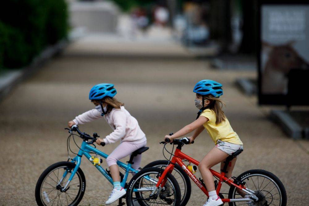 2020年5月18日,两名儿童戴着口罩在美国首都华盛顿国家广场骑车。新华社发(沈霆摄)