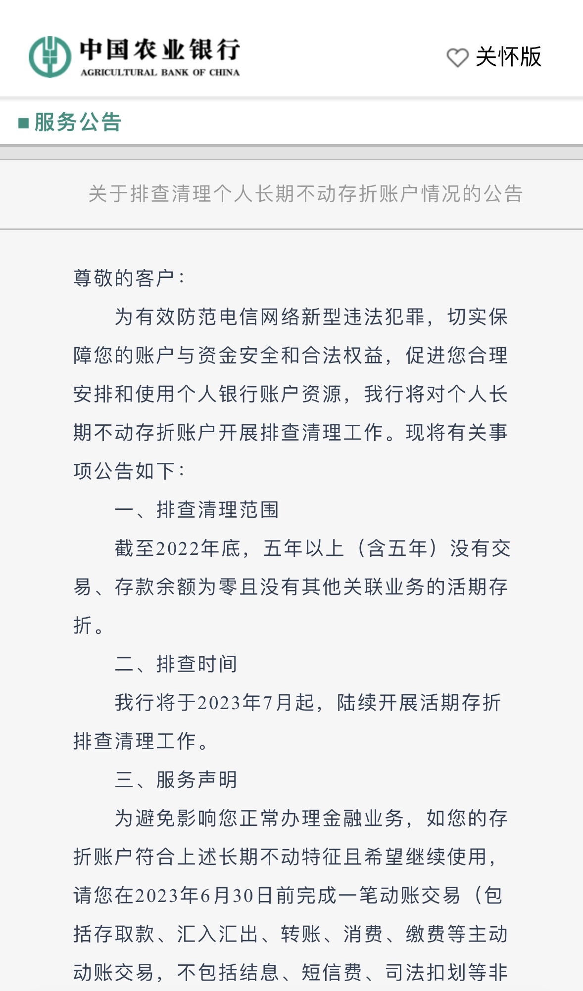 如果还想用自己的账户怎么办?公告显示,如果存折账户符合上述长期不动特征且希望继续使用,客户可以在2023年6月30日前完成一笔动账交易(包括存取款、汇入汇出、转账、消费、缴费等主动动账交易,不包括结息、短信费、司法扣划等非客户主动发起的动账交易)或持有效身份证件到该行网点进行账户激活,在6月30日后该行将陆续对符合长期不动特征的存折账户进行销户处理。