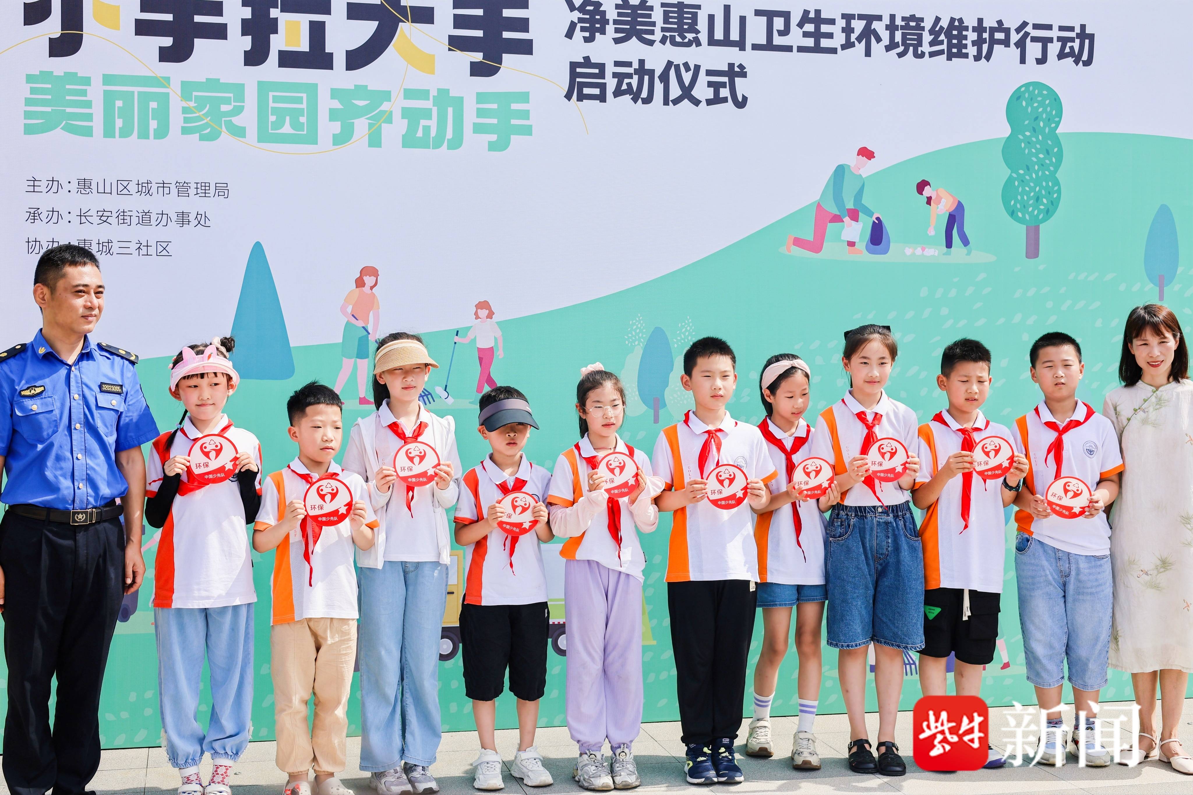 文明无小事,大家共携手。启动仪式上,惠山区城市管理局市容科科长李烽、长安街道城管委办公室常务副主任邹钰、省锡中实验二小党总支书记杨颖芳、长安街道惠城三社区党总支书记陆佳美共同开启“小手拉大手,共建最干净街道”活动。长安街道党工委委员、长安街道建设局局长顾强致辞,他提出希望通过“小手拉大手”的方式,让孩子带动家庭,影响身边人,提高群众自觉维护市容环境,养成文明卫生习惯,共同打造绿色和谐环境,共建生态文明,积极倡导大家从我做起,从身边做起,共建美丽惠山,助推打造全国最干净城市。