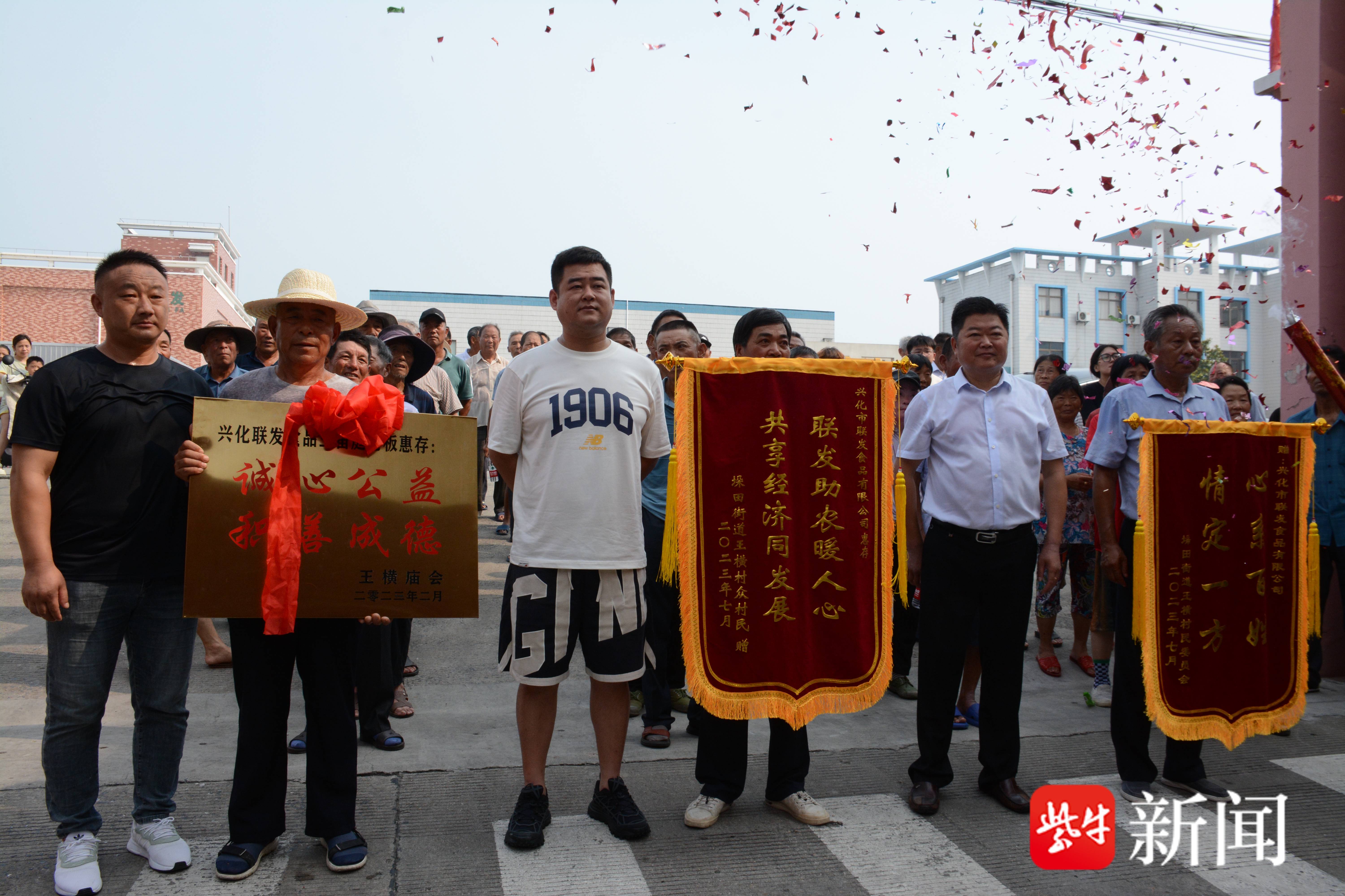 扬子晚报网7月25日讯 (通讯员 兆宽 刘娟 范达 金蕾 记者 王国柱)“王总不简单啊,他处处为我们菜农着想,宁可让自己企业亏损,也没有降我们大葱一分钱。”7月25日上午,兴化市联发食品有限公司门前锣鼓喧天,鞭炮齐鸣,垛田街道王横村的村干部领着舞龙队和150位菜农,给该公司老总送来了上书“心系百姓,情定一方”“联发助农暖人心,共享经济同发展”“诚信公益,积善成德”的锦旗和匾额。