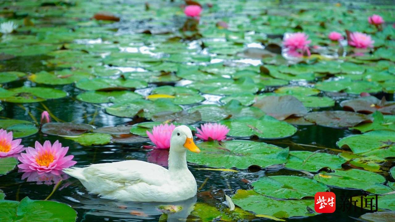 水中绿叶田田,红花艳艳,偶有微风吹来,便有阵阵清香,沁人心脾。柯尔鸭浮在绿波之上,在一众色彩缤纷的睡莲中,借莲叶泛舟左摇右摆,优哉游哉,憨态可掬。