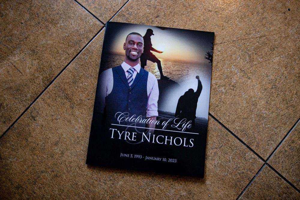这是2月1日在美国田纳西州孟菲斯市泰尔·尼科尔斯追悼会上拍摄的印有尼科尔斯照片的画册。新华社发(梅卡摄)