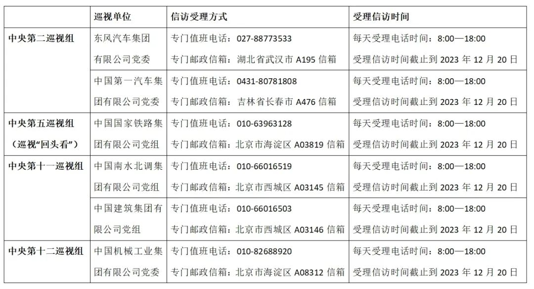 截至目前,中央巡视组已进驻6家单位,并公布了信访联系方式。
