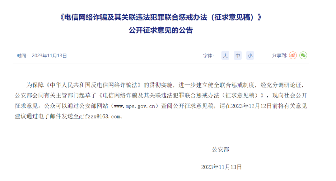 据公安部11月13日公开消息,近日,公安部会同有关主管部门起草了《电信网络诈骗及其关联违法犯罪联合惩戒办法(征求意见稿)》(以下简称《惩戒办法(征求意见稿)》),面向社会广泛征求意见。