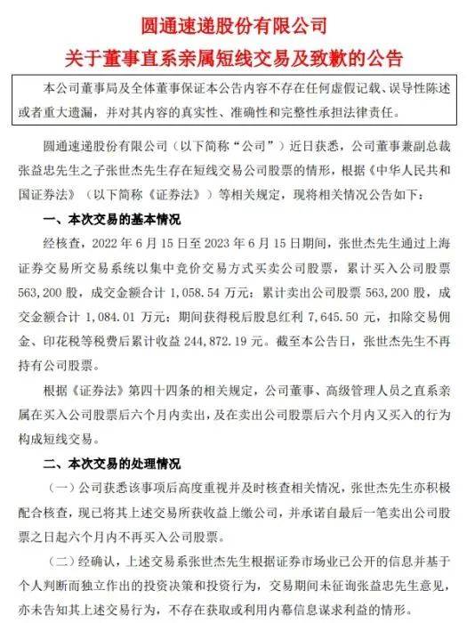 记者注意到,8月5日,圆通速递曾发布关于董事直系亲属短线交易及致歉的公告。当时公告称,经核查,2022年6月15日至2023年6月15日期间,张世杰通过上海证券交易所交易系统以集中竞价交易方式买卖公司股票,累计买入公司股票563200股,成交金额合计1058.54万元;累计卖出公司股票563200股,成交金额合计1084.01万元;期间获得税后股息红利7645.50元,扣除交易佣金、印花税等税费后累计收益244872.19元。