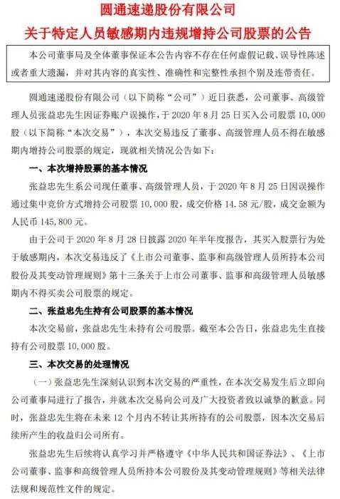2020年8月,圆通速递的一则公告揭露了张益忠违规增持公司股票的事实:时任公司董事、高级管理人员的张益忠因证券账户误操作,于2020年8月25日买入公司股票10000股,还违反了董事、高级管理人员不得在敏感期内增持公司股票的规定。