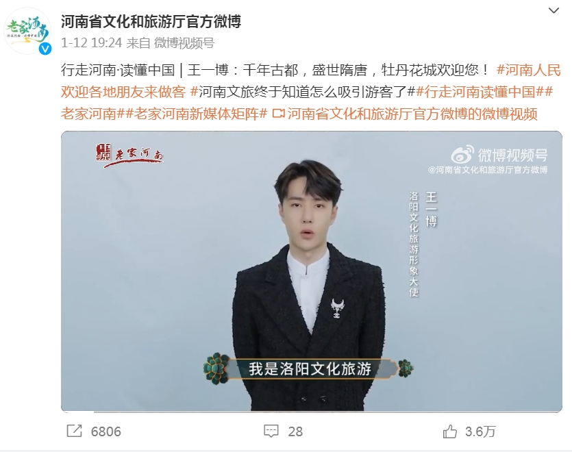 先是12日晚,河南省文化和旅游厅官方微博发布消息称,邀请到了王一博被请来助力河南文旅:“我是王一博,我在洛阳等你。千年古都,盛世隋唐,牡丹花城欢迎您!”