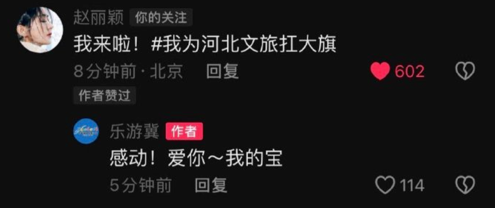 1月13日,收到“河北文旅”和网友喊话,赵丽颖空降评论区:我来啦!我为“河北文旅”扛大旗。