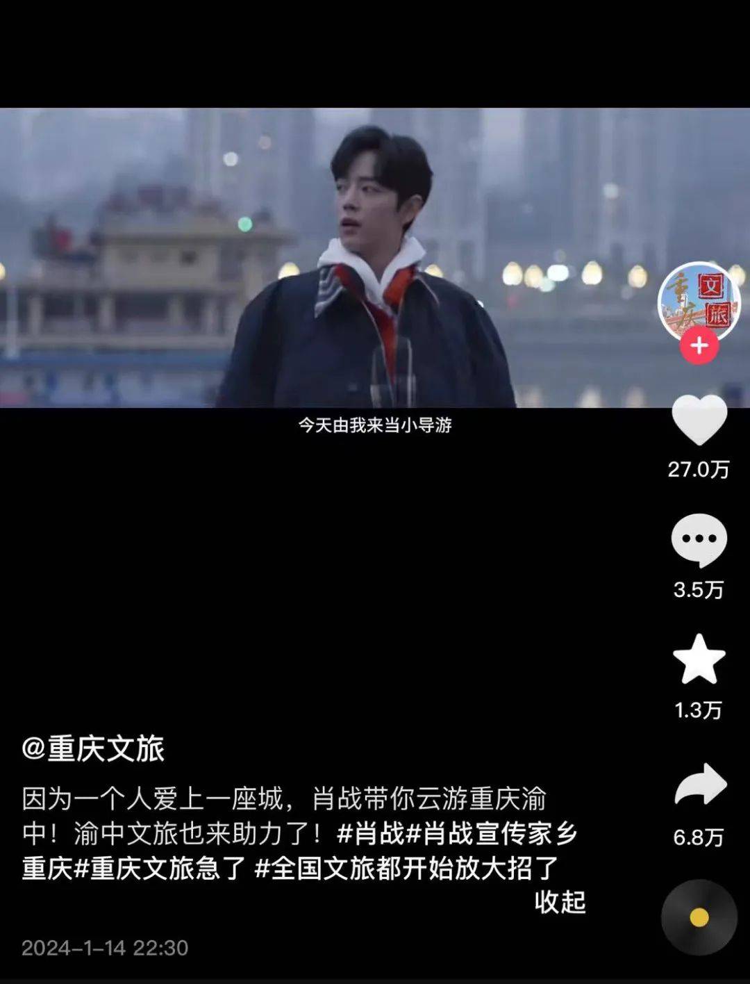 14日晚,重庆文旅也坐不住了,发布了肖战录制视频宣传家乡重庆:“朋友们大家好,我是肖战,我在重庆,请您一起,助力家乡C位出道!”