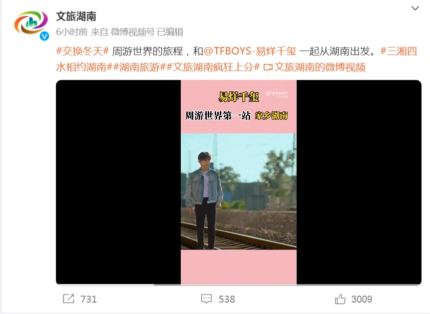 15日,湖南文旅也加入阵营,发文:“周游世界的旅程,和易烊千玺一起从湖南出发。”