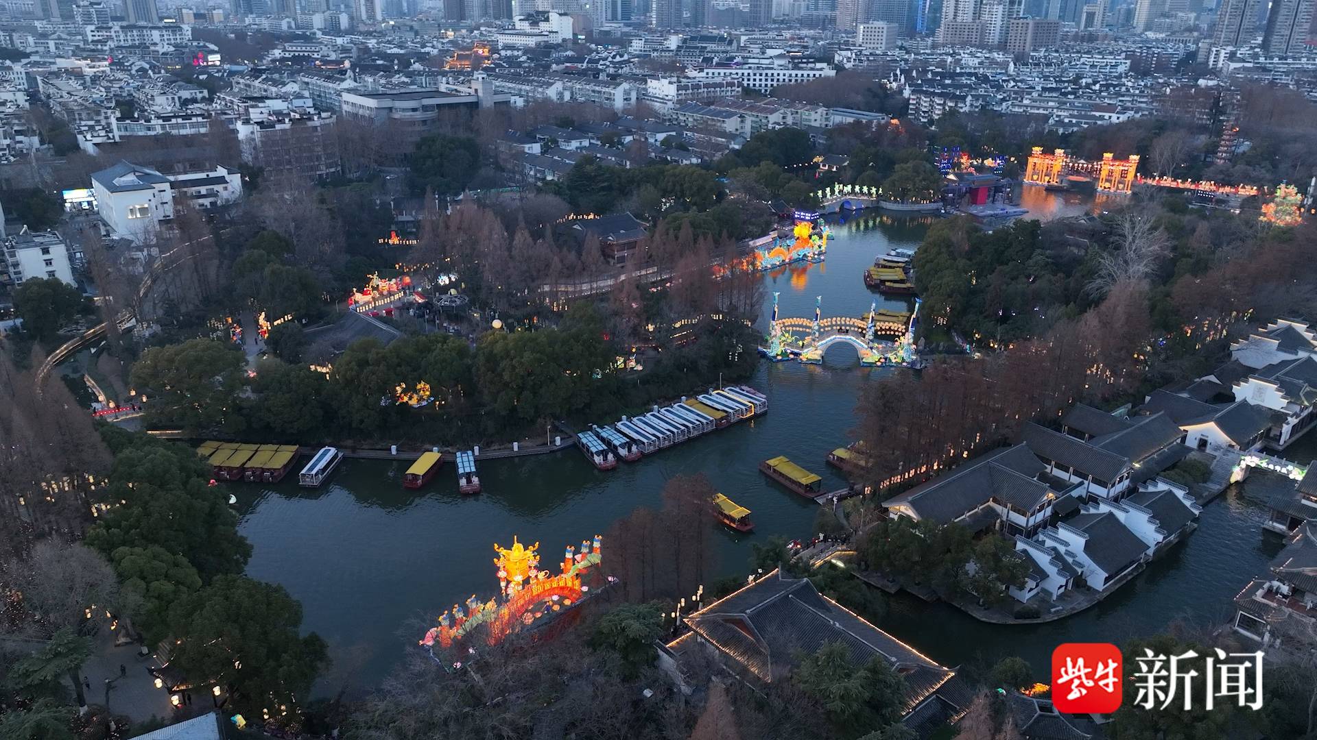 2024新春佳节将至,在南京秦淮区白鹭洲公园,《上元灯彩图》非遗艺术展正在精彩闪耀。据悉,现场灯组设计基于明代传世名画《上元灯彩图》,将当时南京老城南元宵灯会场景以灯彩非遗艺术的形式在市民游客生动呈现。鳌山灯、九色鹿灯……一批画中的精美灯彩再现在市民游客面前。快来跟着航拍镜头看看吧。